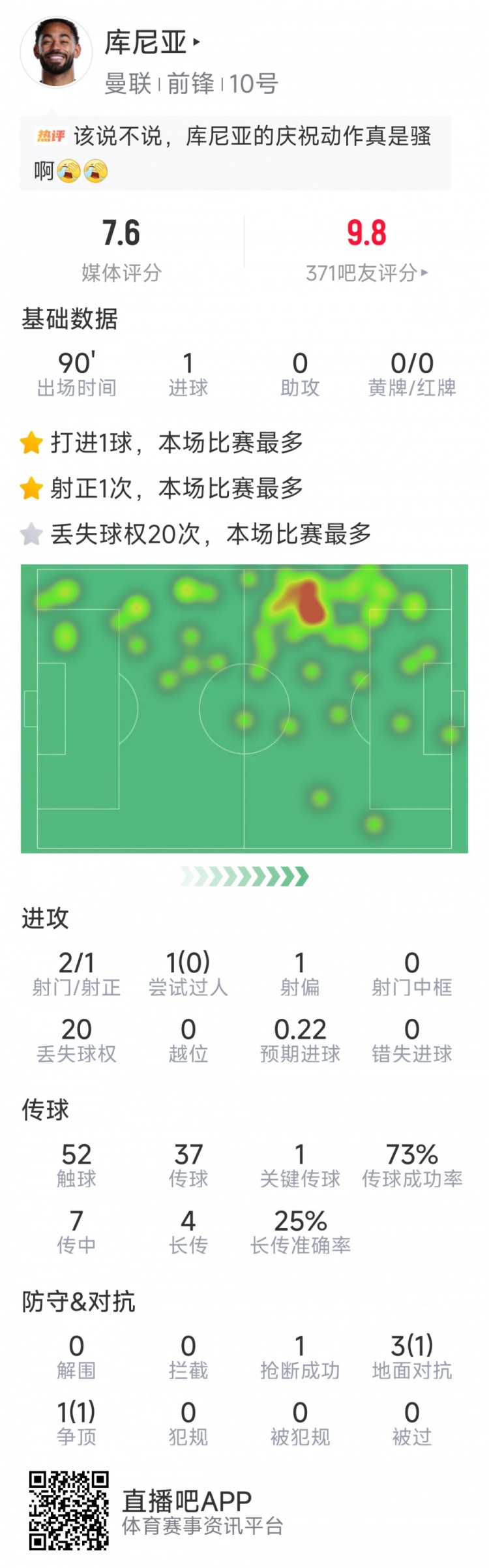 库尼亚本场数据:1粒进球,2射1正,1次关键传球,评分7.6分